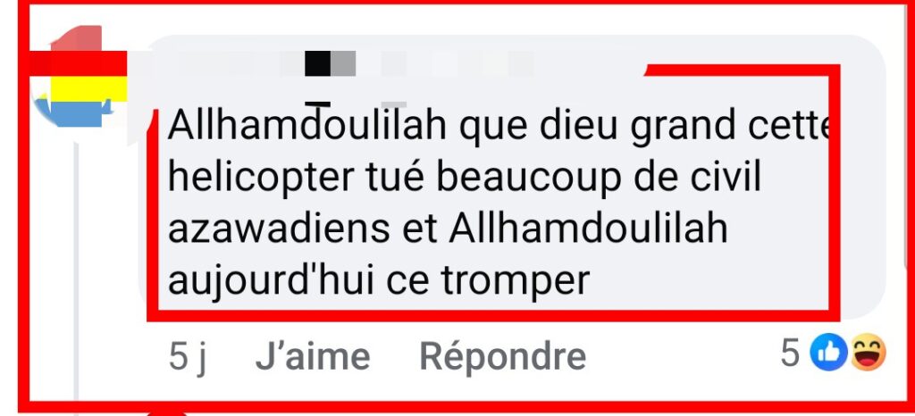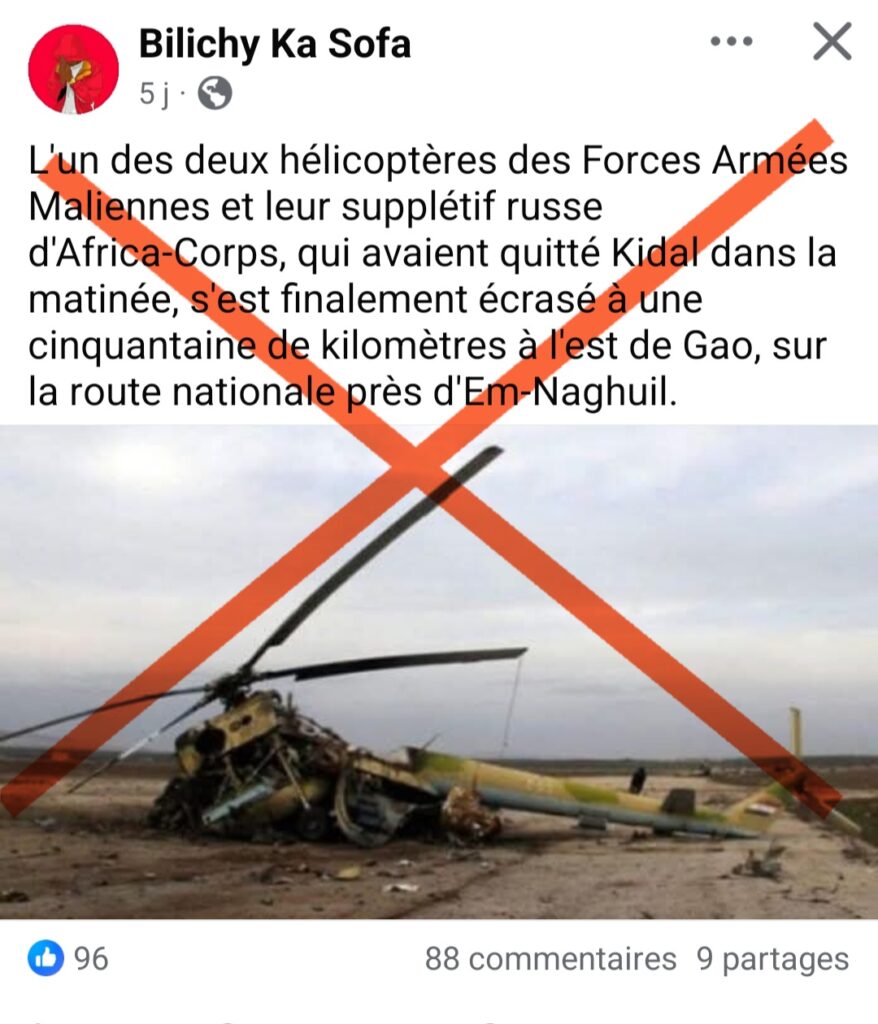Le post évoque un crash d’un des deux hélicoptères des Forces armées maliennes (FAMa), accompagnés de « leur supplétif russe d’Africa-Corps », sur la route d’Em-Naghuil, à l’est de Gao. L’image publiée montre un hélicoptère détruit, et la publication a généré des centaines de réactions.