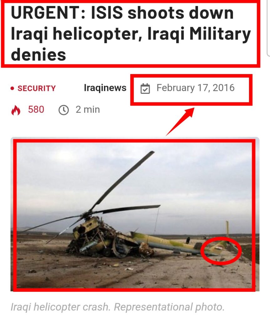 Grâce à une recherche inversée via Google Images, il s’avère que cette photo circule depuis au moins 2016. Elle a illustré plusieurs articles parlant d’un hélicoptère irakien abattu par l’État islamique, comme l’indique clairement ce reportage publié il y a près de dix ans. Le drapeau Syrien, visible sur l’appareil près du rotor, en est la preuve évidente.