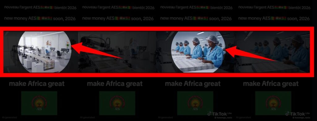 « New money AES soon, 2026 » (nouvelle monnaie de l’AES pour bientôt, 2026 Ndlr), est le texte qui accompagne la vidéo. Alors qu’en observant bien cette vidéo, vous verrez la magie de l’intelligence artificielle derrière.